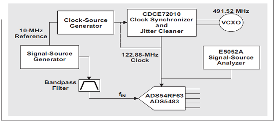 我們做了一個(gè)試驗(yàn),目的是檢查測(cè)得時(shí)鐘相位噪聲與提取自 ADC 測(cè)得 SNR 的時(shí)鐘抖動(dòng)的匹配程度。如圖 11 所示,一個(gè)使用 Toyocom 491.52-MHz VCXO 的 TI CDCE72010 用于產(chǎn)生 122.88-MHz 采樣時(shí)鐘,同時(shí)我們利用 Agilent 的 E5052A 來(lái)對(duì)濾波相位噪聲輸出進(jìn)行測(cè)量。利用一個(gè) SNR 主要受限于采樣時(shí)鐘抖動(dòng)的輸入頻率對(duì)兩種不同的 TI 數(shù)據(jù)轉(zhuǎn)換器(ADS54RF63 和 ADS5483)進(jìn)行評(píng)估??焖俑道锶~變換 (FFT) 的大小為 131000 點(diǎn)。