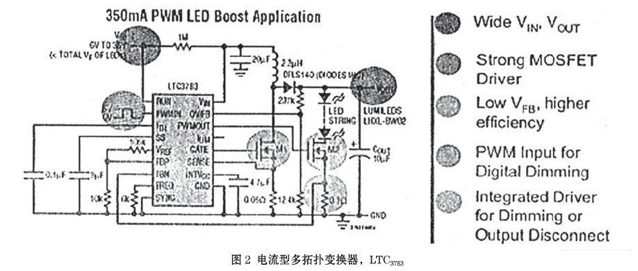 LTC3783是帶恒流PWM調光的電流型多拓撲變換器(圖2),用于驅動大功率LED燈串。本項專利技術可提供非??於鴾蚀_的負載切換,不會產生瞬時的欠電壓或過電壓,能數(shù)字式達到3000∶1的調光率(100Hz),純色的PWM調光可確保白色LED和紅綠藍(RGB) LED的顏色完整性。LTC3783利用模擬控制,容許附加100∶1的調光比,因人眼對周圍光線的變化很敏感,故這一比率必不可少。該多功能的控制器可用于升壓、降壓、升降壓雙向變換器或反激式(Flyback)變換器,或作為恒流/恒壓的調節(jié)器。利用MOSFET的通態(tài)電阻(on-resistance)可取消傳感電流的電阻器,并提高了效率。LTC3783芯片的應用還包括:高電壓LED陣列和LED背光,以及在電訊、自動化與工業(yè)控制系統(tǒng)中的調節(jié)器。