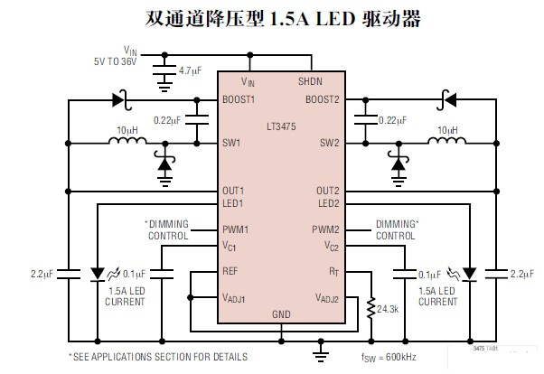 另一種產品LTC3475是雙通道36V、2MHz降壓式DC/DC變換器(圖3)。設計用于恒電流LED驅動電路,能提供每通道1.5A的LED電流。內部的傳感電阻器和調光控制,確保理想的驅動大電流LED,可在50mA~1.5A的電流范圍內,保持高精度的輸出電流,而均勻、純色的PWM電路,能實現(xiàn)3000∶1的調光范圍。