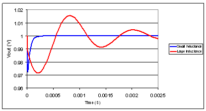 圖 2 對小和大互連電感的負載瞬態(tài)期間的輸出電壓變化模擬情況進行了比較。小電感響應(yīng)快速漸次減弱,而大電感則并非如此,花費了較長的時間才穩(wěn)定下來。這是由于特性阻抗更高以及諧振頻率更低。另外,如果負載電流在該諧振頻率有規(guī)律地跳動,則會出現(xiàn)極寬且具破壞性的電壓變化。