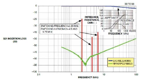 圖1,相比一個100 MHz時電阻為68Ω的傳統(tǒng)鐵氧體磁環(huán),Murata公司的NFM31PC276B0J3 EMI有高的阻抗和低DCR.