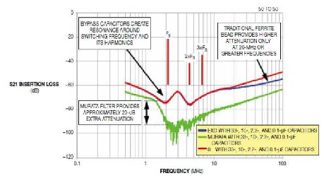 圖1比較了一個采用100MHz時電阻為68Ω的Murata EMI濾波器的傳統(tǒng)鐵氧體磁環(huán)插入損耗。電源電路有低的阻抗,在50Ω環(huán)境下測出插入損耗。因此,電源濾波器的插入損耗量值可能有少許差異,雖然諧振頻率并不變化。