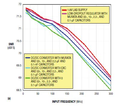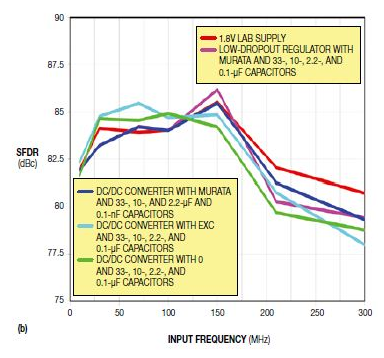 圖4,這些SNR(a)和SFDR(b)掃頻圖比較了一個用低壓差穩(wěn)壓器的基準(zhǔn)電源(如1.8V的實驗室用干凈電源),以及一個采用ADS4149評估模塊、有不同電源濾波器選項的DC/DC轉(zhuǎn)換器。