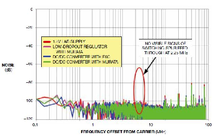 測試結(jié)果表明,在300MHz的中間頻率下,當(dāng)用開關(guān)穩(wěn)壓器供電時,SNR性能比低噪聲低壓差穩(wěn)壓器下降了大約0.3dB.而各種方式的SFDR性能幾乎相同。通過仔細(xì)觀察正態(tài)化的FFT圖(開始于輸入信號,繪制的是噪聲與偏移頻率關(guān)系圖),表明當(dāng)使用次優(yōu)的EXC鐵氧體磁環(huán)時,整個Nyquist區(qū)中的背景噪聲略有升高,而沒有任何開關(guān)頻率饋入的跡象(圖5)。