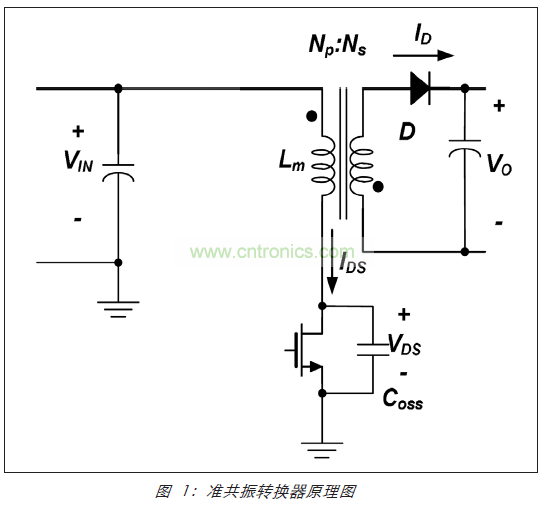 圖 2 顯示準(zhǔn)共振返馳式轉(zhuǎn)換器的典型波形。如果二極管電流在 MOSFET 關(guān)閉后達(dá)到零,則 MOSFET VDS 會由于原邊電感器 (Lm) 與 MOSFET 輸出電容器 Coss 之間的共振而開始振蕩。在 VDS 達(dá)到其最小值時(因漏極與源極之間的電容負(fù)載,降低 MOSFET 導(dǎo)通開關(guān)損耗),通過開啟 MOSFET 來實現(xiàn)準(zhǔn)共振交換。設(shè)計變壓器匝數(shù)比 Np/Ns,以便共振振幅大于 VIN,從而使零電壓開關(guān) MOSFET 能夠?qū)崿F(xiàn)。