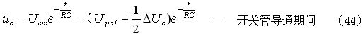 如果考慮電阻R對(duì)電容器C充電時(shí)的分流作用,以及開(kāi)關(guān)管由導(dǎo)通到完全關(guān)斷期間漏極電流(逐步減小)對(duì)電容器C充電時(shí)的分流作用,則(33)和(34)式可以改寫(xiě)為: