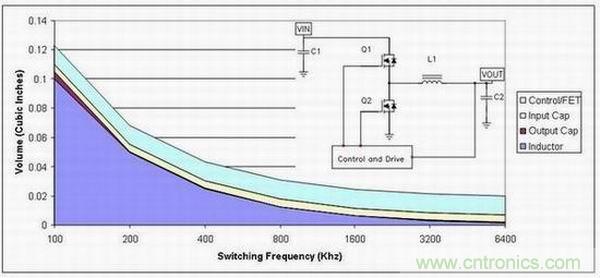 該曲線圖顯示半導(dǎo)體體積本質(zhì)上并未隨頻率而變化,而這一關(guān)系可能過(guò)于簡(jiǎn)單化。與半導(dǎo)體相關(guān)的損耗主要有兩類(lèi):傳導(dǎo)損耗和開(kāi)關(guān)損耗。同步降壓轉(zhuǎn)換器中的傳導(dǎo)損耗與MOSFET的裸片面積成反比關(guān)系。MOSFET面積越大,其電阻和傳導(dǎo)損耗就越低。