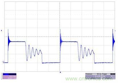 圖2 SEPIC極大地降低了EMI和電壓應(yīng)力。上圖沒(méi)有C1,而下圖則安裝了C1。