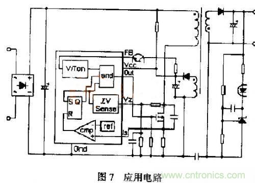 由(9),(10)或可知,調(diào)節(jié)輸出功率、穩(wěn)定輸出電壓可以調(diào)節(jié)導(dǎo)通時間或占空比或調(diào)頻方式或幾種方式綜合應(yīng)用。當(dāng)輸出功率下降或電源電壓上升,導(dǎo)通時間減小,反之導(dǎo)通時間增加;隨輸出功率的增加或減小變壓器初次級電流峰值均增加或減小,由式(3)可知變壓器的釋放儲能時間也隨之增加或減少,為實(shí)現(xiàn)“零電壓”開關(guān),變壓器不能工作在間歇狀態(tài),因此F%IM控制方式不能滿足本文電路的“零電壓”開通的要求?;谏鲜龉ぷ鳁l件的約束,本文電路應(yīng)采用輸出電壓反饋控制導(dǎo)通時間,用“零電壓”檢測控制開關(guān)管導(dǎo)通時刻,即調(diào)頻、調(diào)占空比工作方式。具體電路可以采用通用器件組合,如圖7。