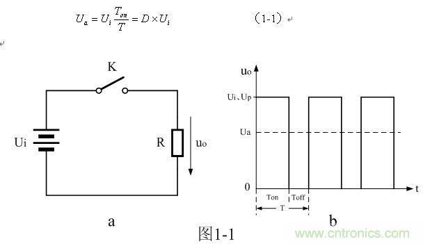 圖1-1-b是串聯(lián)式開(kāi)關(guān)電源輸出電壓的波形,由圖中看出,從控制開(kāi)關(guān)K輸出電壓uo是一個(gè)脈沖調(diào)制方波,脈沖幅度Up等于輸入電壓Ui,脈沖寬度等于控制開(kāi)關(guān)K的接通時(shí)間Ton,由此可求得串聯(lián)式開(kāi)關(guān)電源輸出電壓uo的平均值Ua為: