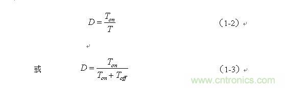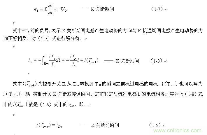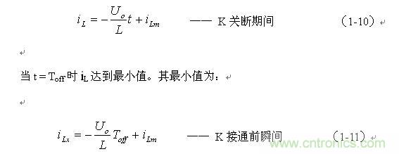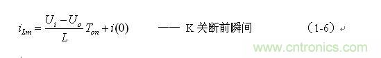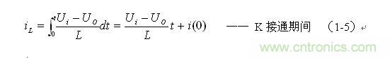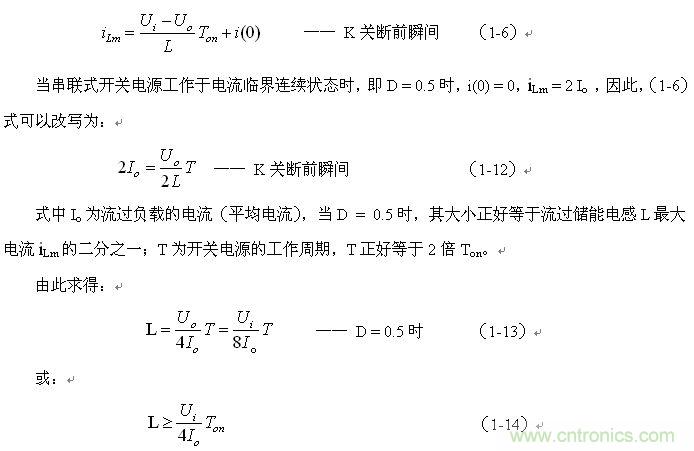 串聯(lián)式開(kāi)關(guān)電源最好工作于電流臨界連續(xù)狀態(tài),或連續(xù)電流狀態(tài)。此時(shí),開(kāi)關(guān)電源輸出電壓的調(diào)整率為最好,且輸出電壓Uo的紋波也不大。因此,我們可以從電流臨界連續(xù)狀態(tài)著手進(jìn)行分析。我們先看(1-6)式: