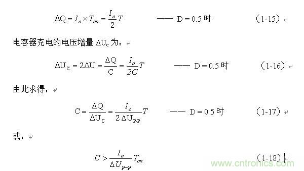 實(shí)際應(yīng)用中,一般都是利用平均值的概念來(lái)計(jì)算儲(chǔ)能濾波電容C的數(shù)值。值得注意的是:濾波電容C進(jìn)行充、放電的電流ic的平均值Ia正好等于流過(guò)負(fù)載的電流Io,因?yàn)?,在D等于0.5的情況下,電容充、放電的時(shí)間相等,只要電容兩端電壓的平均值不變,其充、放電的電流必然相等,并等于流過(guò)負(fù)載的電流Io。