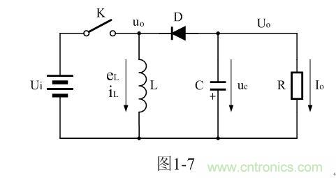 圖1-7中,Ui為輸入電源,K為控制開關(guān),L為儲能電感,D為整流二極管,C為儲能濾波電容,R為負(fù)載電阻。當(dāng)控制開關(guān)K接通的時候,輸入電源Ui開始對儲能電感L加電,流過儲能電感L的電流開始增加,同時電流在儲能電感中也要產(chǎn)生磁場;當(dāng)控制開關(guān)K由接通轉(zhuǎn)為關(guān)斷的時候,儲能電感會產(chǎn)生反電動勢,使電流繼續(xù)流動,并通過整流二極管D進(jìn)行整流,再經(jīng)電容儲能濾波,然后向負(fù)載R提供電流輸出??刂崎_關(guān)K不斷地反復(fù)接通和關(guān)斷過程,在負(fù)載R上就可以得到一個負(fù)極性的電壓輸出。