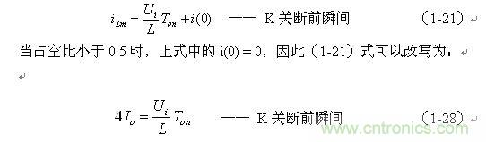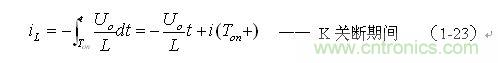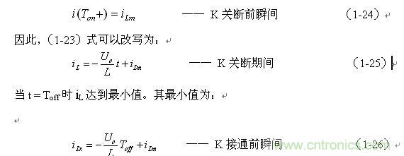 上式中i(Ton+)為控制開關(guān)K從Ton轉(zhuǎn)換到Toff的瞬間流過電感的電流,i(Ton+)也可以寫為i(Toff-),即:控制開關(guān)K關(guān)斷或接通瞬間,之前和之后流過電感L的電流相等。實(shí)際上(1-23)式中的i(Ton+)就是(1-21)式中的iLm,即: