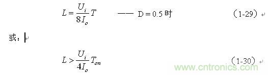(1-29)和(1-30)式,就是計算反轉(zhuǎn)式串聯(lián)開關(guān)電源中儲能電感的公式。同理,(1-29)和(1-30)式的計算結(jié)果,只給出了計算反轉(zhuǎn)式串聯(lián)開關(guān)電源儲能電感L的中間值,或平均值,由于輸出電流的不確定性,實(shí)際應(yīng)用時,可以以此為極限,在此平均值的計算結(jié)果上再乘以一個大于1的系數(shù)。