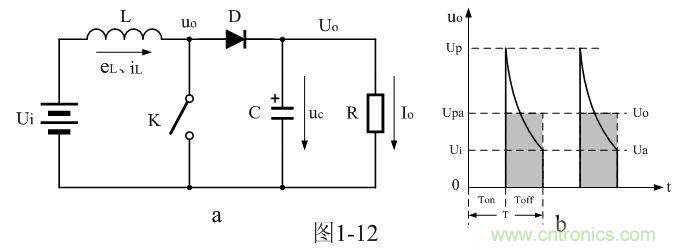 在圖1-12-a中,當(dāng)控制開關(guān)K接通時(shí),輸入電源Ui開始對(duì)儲(chǔ)能電感L加電,流過(guò)儲(chǔ)能電感L的電流iL開始增加,同時(shí)電流在儲(chǔ)能電感L中也要產(chǎn)生反電動(dòng)勢(shì)eL;當(dāng)控制開關(guān)K由接通轉(zhuǎn)為關(guān)斷的時(shí)候,在儲(chǔ)能電感L兩端就會(huì)產(chǎn)生反電動(dòng)勢(shì)eL。eL反電動(dòng)勢(shì)的方向與開關(guān)K關(guān)斷前的方向相反,但與電流的方向相同,因此,在控制開關(guān)K兩端的輸出電壓uo等于輸入電壓Ui與反電動(dòng)勢(shì)eL之和。