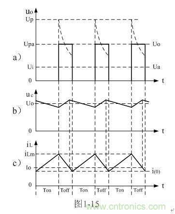 從(1-42)式可以看出,當(dāng)并聯(lián)式開關(guān)電源的負(fù)載R很大或開路時(shí),輸出脈沖電壓的幅度將非常高,隨后,隨著時(shí)間的增長(zhǎng),幅度按指數(shù)下降,最后下降到與輸入電壓Ui基本相同,這種情況有時(shí)是需要避免的,因?yàn)楦邏好}沖很容易通過(guò)靜電感應(yīng),使電路中的其它器件過(guò)壓擊穿,或產(chǎn)生EMI干擾。并聯(lián)式開關(guān)電源輸出電壓經(jīng)濾波之后,可得到一個(gè)高于輸入電壓的輸出電壓,因此并聯(lián)式開關(guān)電源經(jīng)常作為倍壓或升壓電源使用。