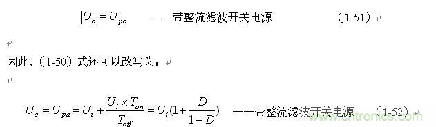 這里特別指出:(1-50)和(1-52)式的結(jié)果,雖然是以開關(guān)電源工作于電流臨界連續(xù)狀態(tài)的條件求得,但對(duì)于開關(guān)電源工作于連續(xù)電流狀態(tài)或斷流狀態(tài)同樣成立,因?yàn)?,輸出電壓Uo是取自輸出脈沖電壓uo的半波平均值Upa,而不是取其平均值Ua。