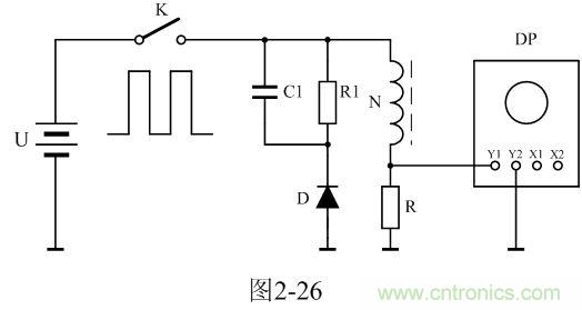 圖2-26中,U是電源電壓,通過控制開關(guān)K不斷地接通和關(guān)斷,就可以把電源電壓調(diào)制成單極性電壓脈沖;N為變壓器初級(jí)線圈,D為反激輸出整流二極管;R1為反激輸出負(fù)載電阻;C1為濾波電容;R為取樣電阻,通過測量R兩端的電壓,就可以知道流過變壓器初級(jí)線圈的電流;取樣電壓被送到示波器DP進(jìn)行顯示。