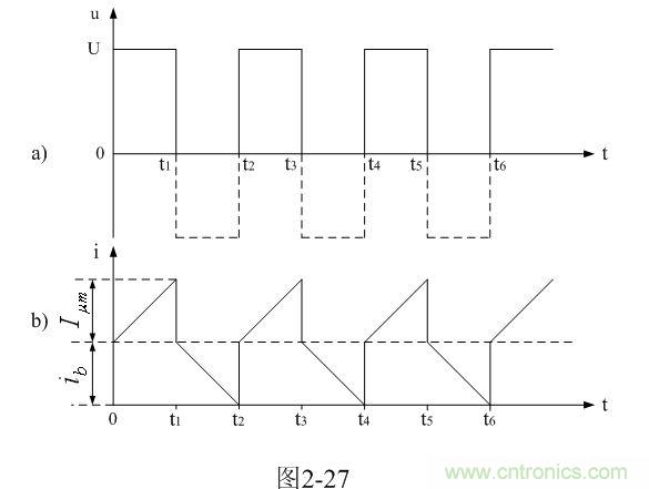 我們從圖2-27-b中可以看出,在輸入電壓作用期間,勵(lì)磁電流 是跟隨時(shí)間線性增長的;而渦流損耗電流