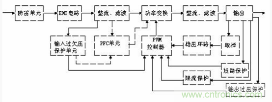 開關(guān)電源的主要電路是由輸入電磁干擾濾波器(EMI)、整流濾波電路、功率變換電路、PWM 控制器電路、輸出整流濾波電路組成。輔助電路有輸入過欠壓保護(hù)電路、輸出過欠壓保護(hù)電路、輸出過流保護(hù)電路、輸出短路保護(hù)電路等。