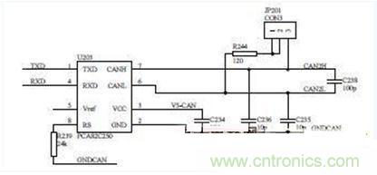 在電路中可根據(jù)整車要求,是否接入120Ω的終端電阻,當(dāng)JP201跳線接1腳和2腳時(shí),不接入電阻,當(dāng)接2腳和3腳時(shí),電阻接入。