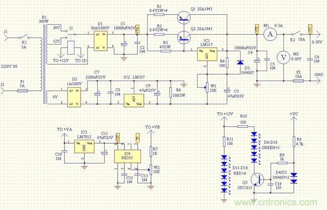 圖:簡單易制、低廉高效的0-30V/10A可調穩(wěn)壓電源電路原理