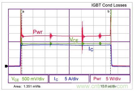 導(dǎo)電損耗的量測(cè)方式類似。它們應(yīng)當(dāng)起于導(dǎo)通損耗終點(diǎn),終于關(guān)閉損耗起點(diǎn)。這可能難于精確量測(cè),因?yàn)閷?dǎo)電損耗的時(shí)間刻度遠(yuǎn)大于
