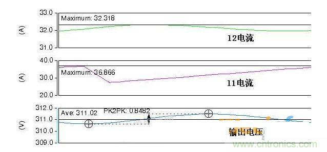 如圖6所示,輸出總電容=6.6uF,輸出紋波0.85V,l1峰值電流37A,l2峰值電流32A。