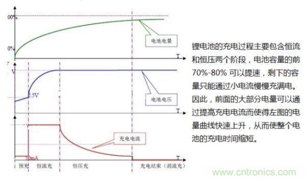 隨著對鋰電池容量的要求越來越高,鋰電池廠家也在加快新型電池的研發(fā),額定充電電壓從傳統(tǒng)的4.2V提高到4.35V,目前又出現(xiàn)了4.4V充電電壓的鋰電池,容量進(jìn)一步提高。而傳統(tǒng)的充電器輸出電壓為5V,充電控制電路會(huì)調(diào)節(jié)充電電壓和電流滿足鋰電池的充電特性。不同鋰電池的化學(xué)特性不同,因此充放電性能及安全性能也就不同,有的電池芯適合大電流充放電,而有些電池芯可以耐高電壓,所以,采用何種快速充電方式要取決于鋰電池芯的具體特性。提高充電器的輸出電壓可以在恒流階段提高充電功率,實(shí)現(xiàn)快速充電。