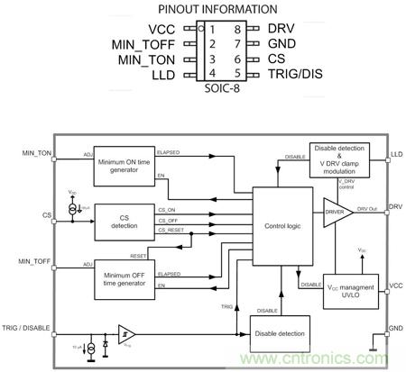 NCP4305可采用SOIC-8、DFN8和WDFN8三種封裝。MIN_TOFF 和MIN_TON引腳通過連接電阻到地,調(diào)節(jié)最小關(guān)斷和最小導(dǎo)通時間。LLD引腳用于在輕載時調(diào)節(jié)驅(qū)動器鉗位電平,或關(guān)斷驅(qū)動器。DRV引腳是同步整流MOSFET的驅(qū)動器輸出。CS(電流采樣檢測)引腳用于檢測電流是否流過同步整流MOSFET。TRIG/DIS引腳提供超快關(guān)斷輸入,用作在CCM應(yīng)用中關(guān)斷同步整流MOSFET以提升能效,當(dāng)上拉超過100 us時激活禁用模式。