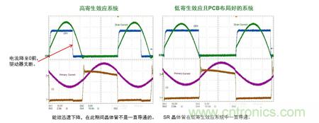 在CCM應(yīng)用中,當(dāng)初級端MOS管導(dǎo)通時,通過隔離驅(qū)動器強(qiáng)制使次級端MOS管關(guān)斷;當(dāng)初級端MOS管關(guān)斷, TRIG腳功能使次級端MOS管導(dǎo)通。這種交替導(dǎo)通特性大大提高系統(tǒng)能效。如圖5所示,無觸發(fā)功能的初級端和次級端驅(qū)動信號交疊的時間為40 ns,遠(yuǎn)大于帶觸發(fā)功能的12 ns,也就是說,觸發(fā)功能將縮短延遲時間,從而降低損耗。