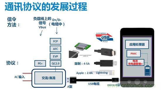 實(shí)現(xiàn)快充的前提是實(shí)現(xiàn)充電器端和手機(jī)端進(jìn)行通訊,如此便涉及到通訊協(xié)議的問(wèn)題。協(xié)議不同接口會(huì)有所差異,針對(duì)不同的協(xié)議接口,PI有不同的解決方法,在USB電纜中,指令通過(guò)數(shù)據(jù)線傳輸,數(shù)據(jù)線根據(jù)不同的通訊協(xié)議要求,通過(guò)D+、D-傳送指令信號(hào),這種方式最早應(yīng)用于高通公司的QC2.0協(xié)議,目前已經(jīng)進(jìn)展至QC3.0版本,進(jìn)一步對(duì)快充性能進(jìn)行了優(yōu)化。而即將興起的USB-PD協(xié)議,則可以完全實(shí)現(xiàn)雙向通訊,且其傳輸功率可以進(jìn)一步增加,應(yīng)用前景將更加廣闊。相信在很多充電應(yīng)用領(lǐng)域會(huì)被廣泛采用。