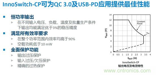 不管提高電流還是電壓,最終目的都是提高輸出功率,PI全新產(chǎn)品InnoSwitch-CP系列實(shí)現(xiàn)18w恒功率輸出,降低線路上的損耗,改善手機(jī)發(fā)熱,實(shí)現(xiàn)真正快速充電。