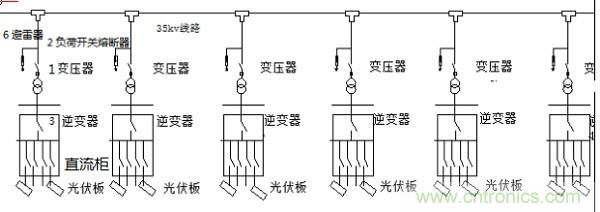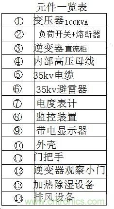 2、交流電經(jīng)100KVA變壓器1,直接升壓至35KV,變壓器、高壓隔離開關(guān)熔斷器、逆變器、避雷器等裝在一套箱變內(nèi)。