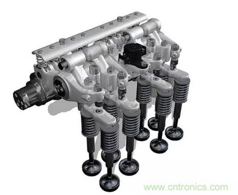 凸輪從動(dòng)件下方安裝一個(gè)橋接器,含有一個(gè)控制電磁閥來調(diào)節(jié)液壓油向液壓執(zhí)行機(jī)構(gòu)的流動(dòng),而作用位置是凸輪而不是常規(guī)的凸輪從動(dòng)件;液壓 油供應(yīng)來自于搖桿軸上的孔隙。動(dòng)力輸出條件下電磁閥關(guān)閉,執(zhí)行機(jī)構(gòu)活塞鎖定在橋接器上,使得排氣閥門跟隨凸輪完成正常四沖程運(yùn)動(dòng)。當(dāng)需要制動(dòng)的時(shí)候,電磁 閥開啟并與橋接器上執(zhí)行機(jī)構(gòu)脫離,排氣閥門依然處于關(guān)閉狀態(tài),直到氣缸活塞到達(dá)上止點(diǎn)位置。因?yàn)橥馆喺_\(yùn)轉(zhuǎn),而橋接器無法改變排氣閥舉升高度和時(shí)間長 短,所以制動(dòng)效應(yīng)不會(huì)給發(fā)動(dòng)機(jī)做功過程完整性造成麻煩。