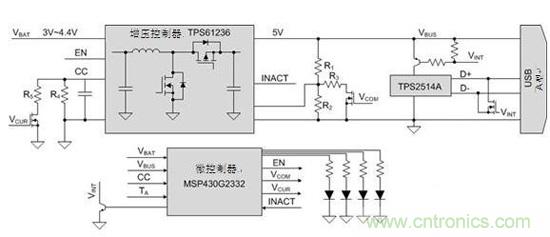 管理移動(dòng)電源子系統(tǒng)的活動(dòng)對(duì)保持電池的能級(jí)至關(guān)重要,避免將其浪費(fèi)在內(nèi)部功能上。該參考設(shè)計(jì)中包含一個(gè)MSP430?微控制器(MCU),其作為內(nèi)務(wù)處理型MCU,用來(lái)優(yōu)化移動(dòng)電源的功耗。當(dāng)MCU檢測(cè)負(fù)荷較低時(shí),它會(huì)關(guān)閉大部分子系統(tǒng);待機(jī)狀態(tài)下,移動(dòng)電源僅消耗22mA電量。為防止電池出現(xiàn)高放電電流,MCU會(huì)調(diào)整限流。當(dāng)負(fù)荷電流發(fā)生變化時(shí),MCU還會(huì)對(duì)輸出電壓做出小幅調(diào)整,從而提供一個(gè)穩(wěn)壓良好的輸出。最后,MCU通過(guò)其集成的模數(shù)轉(zhuǎn)換器(ADC)測(cè)量電池電壓和溫度。然后,MCU驅(qū)動(dòng)LED來(lái)顯示電池電壓并監(jiān)視溫度,以保持移動(dòng)電源處于安全工作范圍。