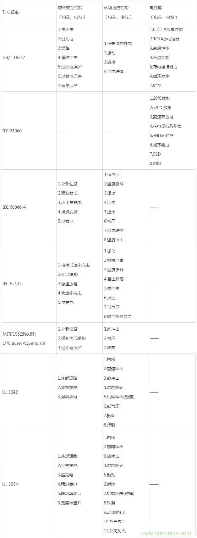 今天編輯將這些主要鋰電池標(biāo)準(zhǔn)分別從不同的角度考察了鋰電池的安全性和電性能,現(xiàn)將分類如下。從表上可以看出,目前鋰電池各種標(biāo)準(zhǔn)主要從三個角度考察鋰電池的安全及電性能: