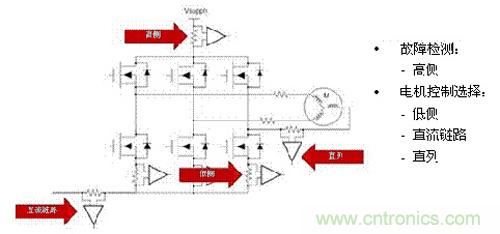 晶體管IGBT也很常見(jiàn))來(lái)驅(qū)動(dòng)直流電動(dòng)機(jī)。該圖還包括高側(cè)電流感應(yīng),其通常在顯著錯(cuò)誤情況下使用,比如接地電路短路的情況。