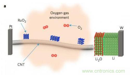 環(huán)境透射電子顯微鏡能夠在氧氣環(huán)境下進(jìn)行工作,從而使得在原子級(jí)別對(duì)鋰氧電池的反應(yīng)過程進(jìn)行直接的觀測成為可能。實(shí)驗(yàn)中Langli Luo利用載有納米R(shí)uO2催化劑的CNT作為正極,金屬Li作為負(fù)極,金屬Li表層的Li2O作為固體電解質(zhì),電池結(jié)構(gòu)如下圖所示。