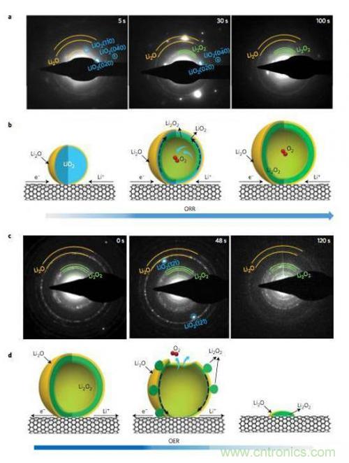 研究顯示,初始反應(yīng)產(chǎn)物L(fēng)iO2很快會(huì)發(fā)生歧化反應(yīng)生成Li2O2和O2,在顆粒內(nèi)部釋放的O2被封鎖在了顆粒的內(nèi)部,從而導(dǎo)致了顆粒成為中空結(jié)構(gòu),如下圖所示。從SAED的分析結(jié)果來看,在開始的幾秒鐘時(shí)間內(nèi),反應(yīng)產(chǎn)物中只有LiO2,30秒之后,Li2O2和LiO2開始共存,大約100s后LiO2的衍射峰消失,反應(yīng)產(chǎn)物只剩下Li2O2和Li2O,TEM分析結(jié)果顯示中空球的外側(cè)為Li2O,內(nèi)側(cè)為Li2O2。充電過程則正好相反,開始的時(shí)候觀察到了Li2O和Li2O2的衍射峰,在48s時(shí)出現(xiàn)了LiO2的衍射峰,但是在120s時(shí)并沒有再出現(xiàn)LiO2的衍射峰,說明LiO2只是Li2O2分解的一個(gè)中間產(chǎn)物。整個(gè)過程為我們揭示了Li-O2電池的充放電反應(yīng)途徑,在放電的時(shí)候,Li+通過電解液擴(kuò)散到CNT表面,在三相界面發(fā)生反應(yīng),生成LiO2,然后LiO2發(fā)生歧化反應(yīng)(LiO2?Li2O2+O2),生成Li2O2和O2,反應(yīng)釋放的O2會(huì)將反應(yīng)產(chǎn)物從最初的10nm左右,吹到100nm左右,而在產(chǎn)物的表面由于有豐富的Li+,因此會(huì)與O2反應(yīng)生成Li2O。在充電的過程中,Li2O2首先會(huì)失去一個(gè)Li+和一個(gè)電子,形成LiO2,隨后LiO2發(fā)生分解,產(chǎn)生Li2O2和O2,然后Li2O2再次失去Li+和電子,如此循環(huán)指導(dǎo)所有的Li2O2消耗完畢。