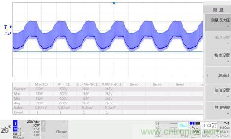 實(shí)測100~240VAC輸入開關(guān)電源初次級最大電壓波形如下圖3所示,工作電壓峰值為500V,工作電壓有效值為265V,根據(jù)表2J可知交流電網(wǎng)電源瞬態(tài)電壓為2500V。