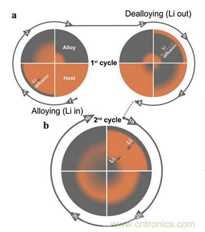 在第1次合金化過程中,Li+首先進(jìn)入從活性物質(zhì)顆粒表面,產(chǎn)生濃度差。然后以進(jìn)一步向顆粒內(nèi)部擴(kuò)散,形成Li+濃度梯度分布。但是,顆粒內(nèi)部仍有Li+難以到達(dá)的區(qū)域;