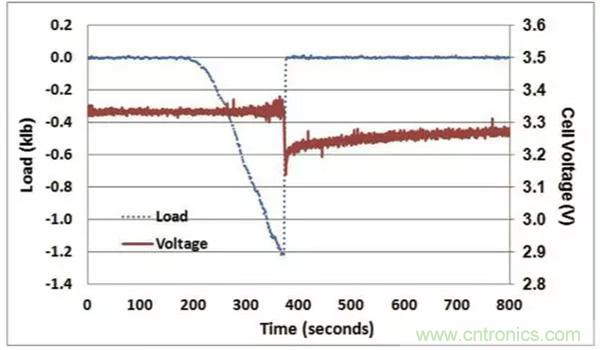 為了方便讀者理解本文,下圖是給出了LFP電池一個非常典型的成功通過機(jī)械擠壓測試(正反饋)的判據(jù),電池擠壓變形達(dá)到一定的程度后,引起了電池內(nèi)短路的發(fā)生,電池電壓迅速下降,檢測到電壓下降后(0.1V),擠壓力隨之被移除,電池的電壓快速回升,電池沒有發(fā)生熱失控,則電池通過擠壓實驗。