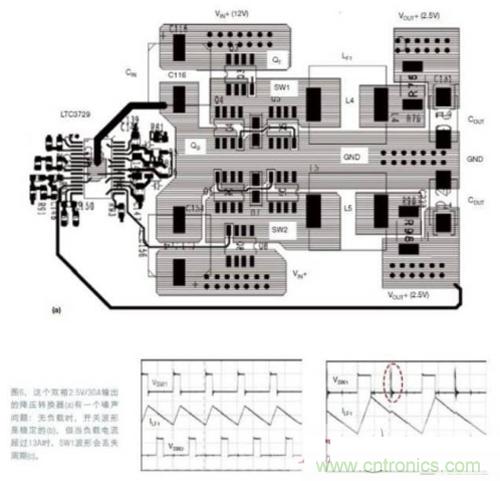 圖6和圖7(略)提供了一個同步降壓電路的例子,它強調了去耦電容的重要性。圖6a是一個雙相12VIN、2.5VOUT/30A(最大值)的同步降壓電源,使用了LTC3729雙相單VOUT控制器IC.在無負載時,開關結點SW1和SW2的波形以及輸出電感電流都是穩(wěn)定的(圖6b)。但如果負載電流超過13A,SW1結點的波形就開始丟失周期。負載電流更高時,問題會更惡化(圖6c)。