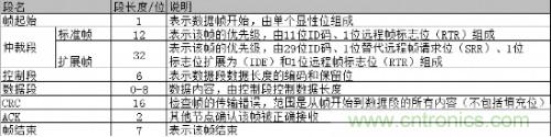 目前使用最廣泛的CAN-bus網(wǎng)絡(luò)標(biāo)準(zhǔn)是V2.0版本,該標(biāo)準(zhǔn)又分為A、B兩部分,它們主要的區(qū)別在仲裁區(qū)域的ID碼長度。其中CAN2.0A(標(biāo)準(zhǔn)幀)為11位ID,CAN2.0B(擴(kuò)展幀)為29位ID。下表1為CAN報(bào)文結(jié)構(gòu):