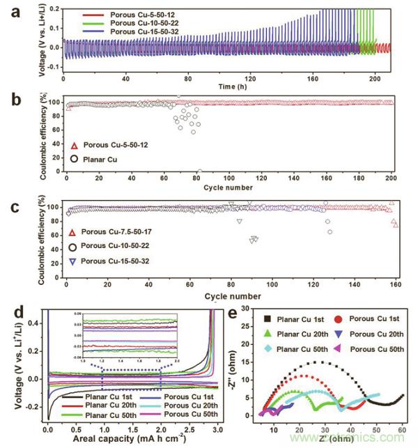 c)鋰沉積在多孔Cu-7.5-50-17、Cu-10-50-22、Cu-15-50-32時的循環(huán)穩(wěn)定性能及庫倫效率
