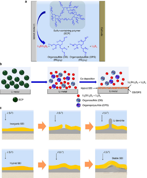 b)多硫化物/多巨硫化合物-Li2S/Li2S2雜化SEI膜形成示意圖;
