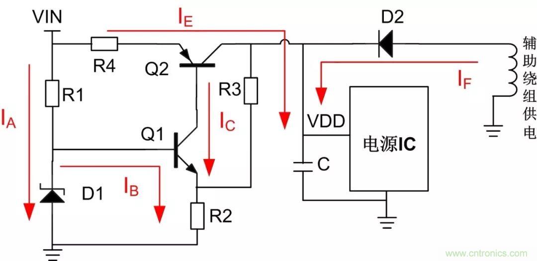輸入電壓VIN為NPN三極管Q1提供IB電流使用它處于放大區(qū),IC為放大電流也為PNP三極管Q2的基極電流,通過(guò)對(duì)IC電流的控制,可使Q2處于飽和狀態(tài)并以IE的飽和電流向電容C充電,直到Q2處于半截止或半飽和狀態(tài)。此時(shí),電容就等效成一個(gè)恒流源為IC芯片提供能量,當(dāng)電容電壓降到一定值時(shí),啟動(dòng)電路繼續(xù)為電容充電,直到輔助供電有電壓后,才通過(guò)電阻R2、R3之間的分壓使Q1處于截止?fàn)顟B(tài),此時(shí)啟動(dòng)電路才停止工作,之后芯片的供電完全由輔助繞組提供。