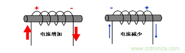當(dāng)交流電通過(guò)電感時(shí),電流產(chǎn)生的磁場(chǎng)將其他的繞線切隔,因而產(chǎn)生反向電壓,從而阻礙電流變化。反之當(dāng)電流減少時(shí),則向電流增加的方向產(chǎn)生。
